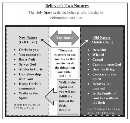 When anyone is restored to the relationship with God through faith in Jesus Christ, his or her old sinful nature remains (Rom. 7:18). But God gives every believer a new nature. The two natures are contrary to one another and creates great conflict in the life of every believer (Gal. 5:17). The chart belows distinguishes the differences between the two.