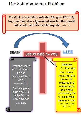 The GOOD NEWS is that God dealt with our sin problem. Jesus, fully God and fully Man, died a substitutionary death for us. He died in our place. He paid our sin debt so we have no debt to pay. “For God so loved the world that He gave His only begotten Son (Jesus), that whoever believes in Him should not perish, but have everlasting life”(John 3:16). He rose again on the third day proving that He has the power over sin and death.