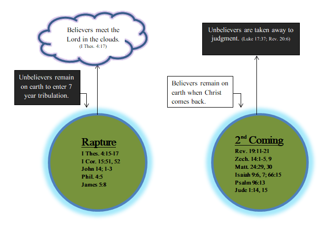 At the rapture the believers are removed from earth to meet the Lord in the air. Only unbelievers are left on the earth. Many of them come to faith in Christ after the rapture (Rev. 7:9-14). Then at the second coming, when Christ returns to earth, those who have come to faith in Christ and survived the tribulation remain on the earth to enter in Christ’s kingdom on earth. He then reigns for a thousand years. Those who have continued in unbelief are removed to judgment (Rev. 20: 6; Luke 17:37).
